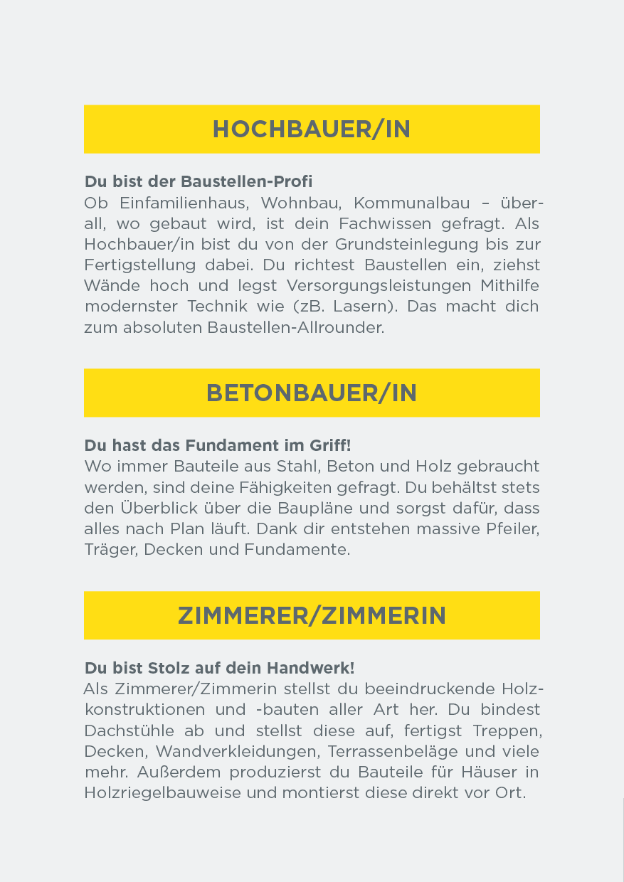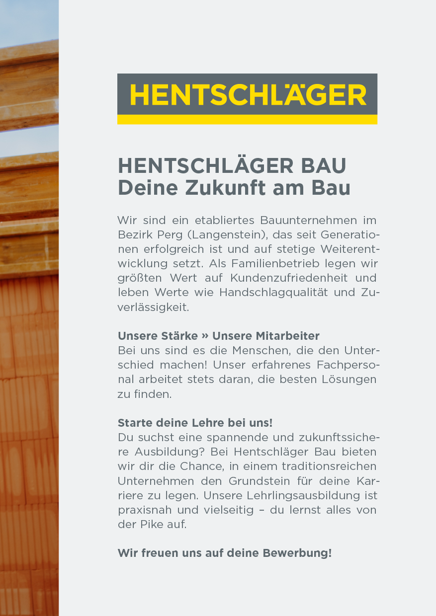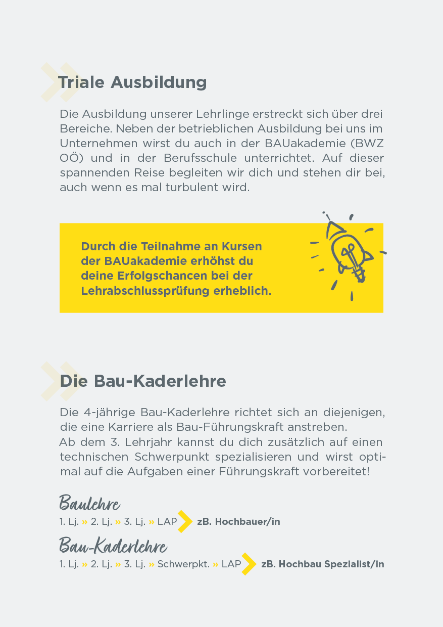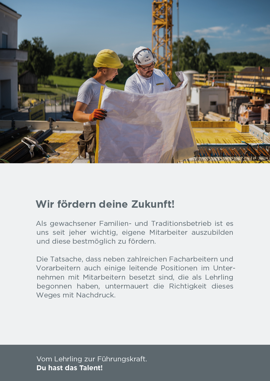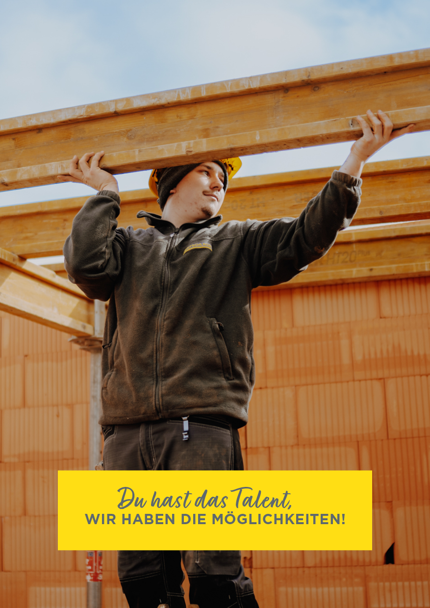 Nutze dein handwerkliches Talent und starte deine Karriere mit einer Ausbildung am Bau! Setze den ersten Grundstein für deinen beruflichen Erfolg. Wir sind stets auf der Suche nach engagierten, jungen Talenten, die sich für den Hochbau, Betonbau, Dachdecker-, Spengler– oder Zimmerer-Beruf begeistern.