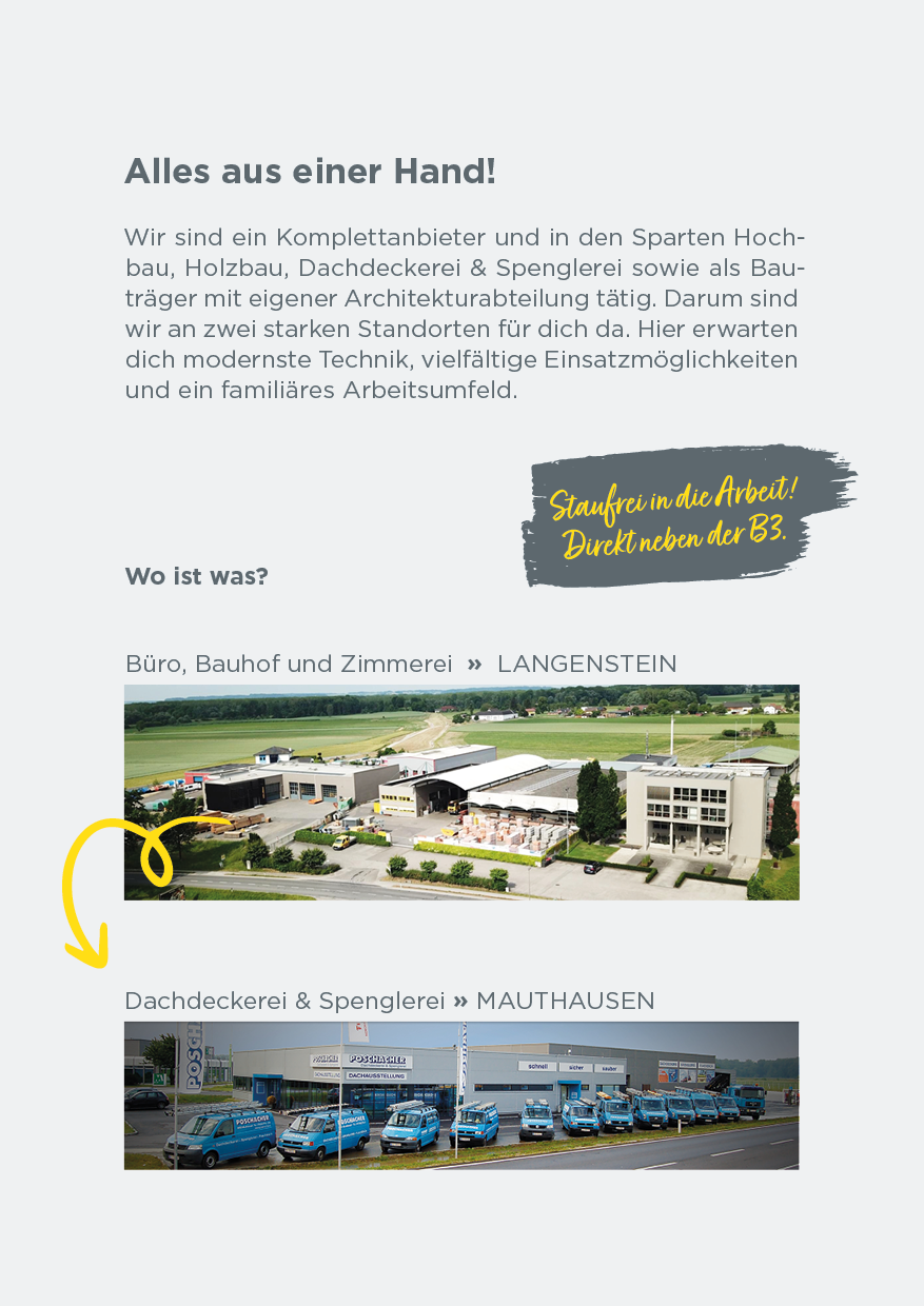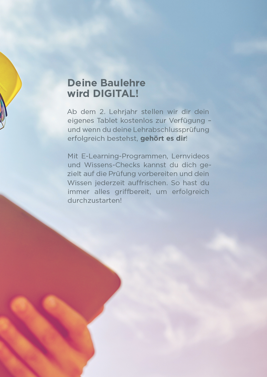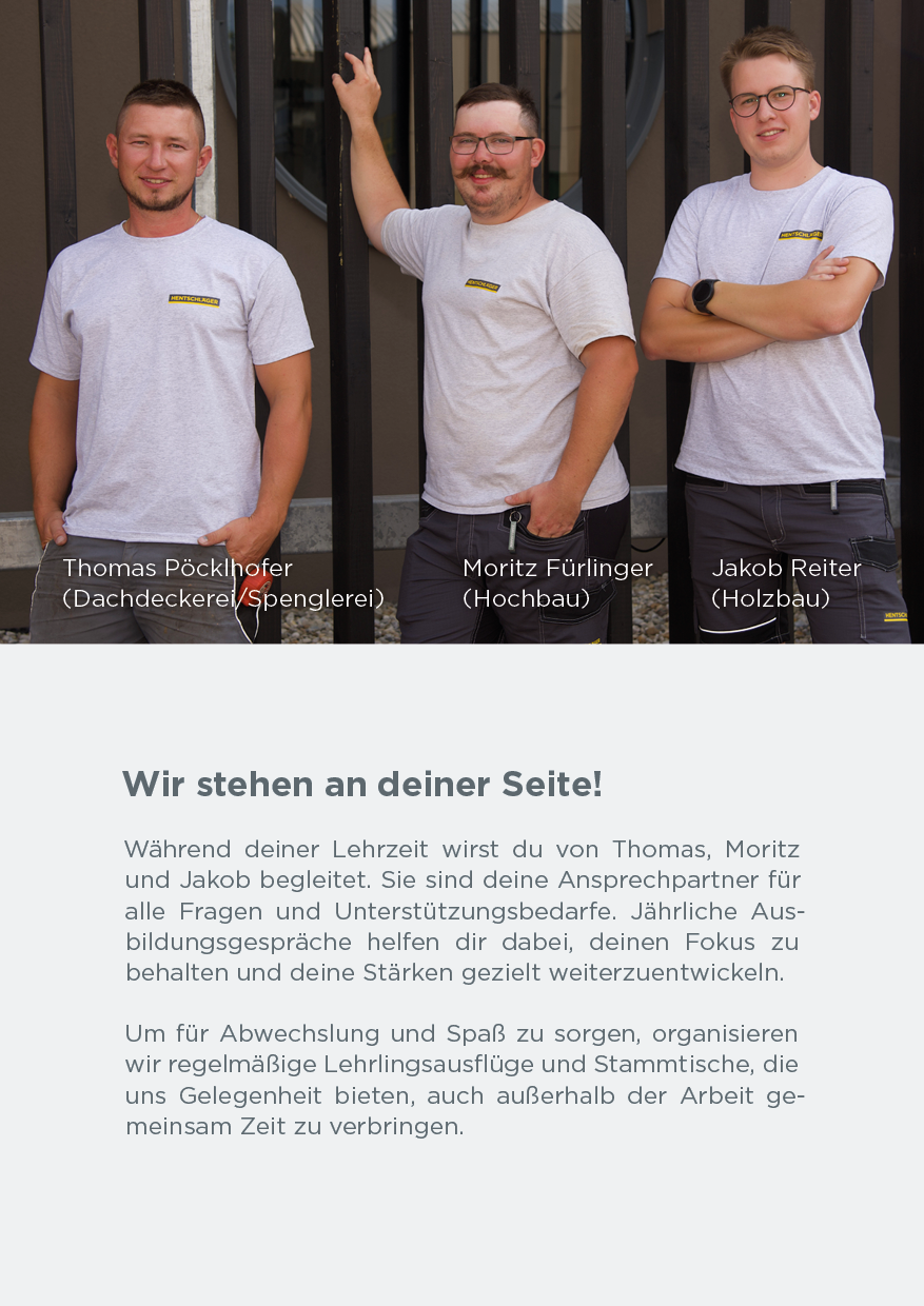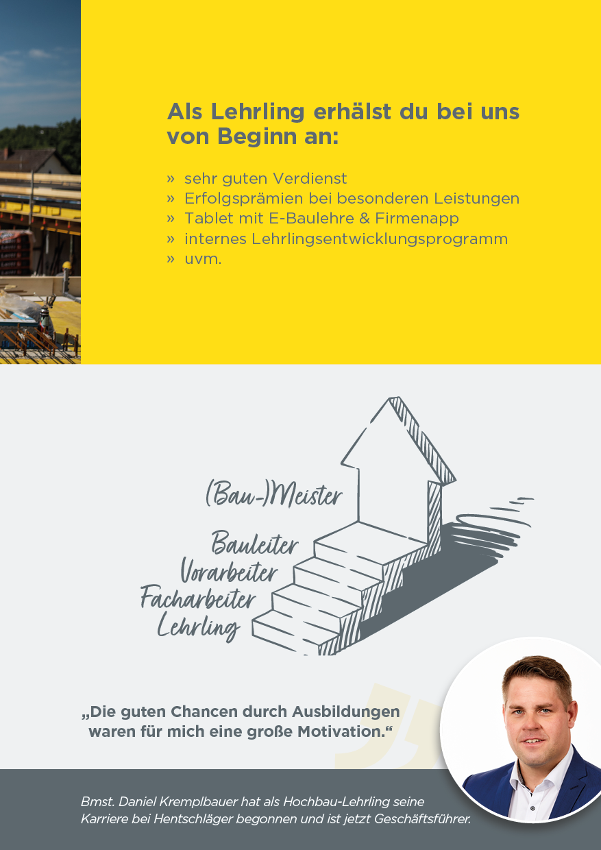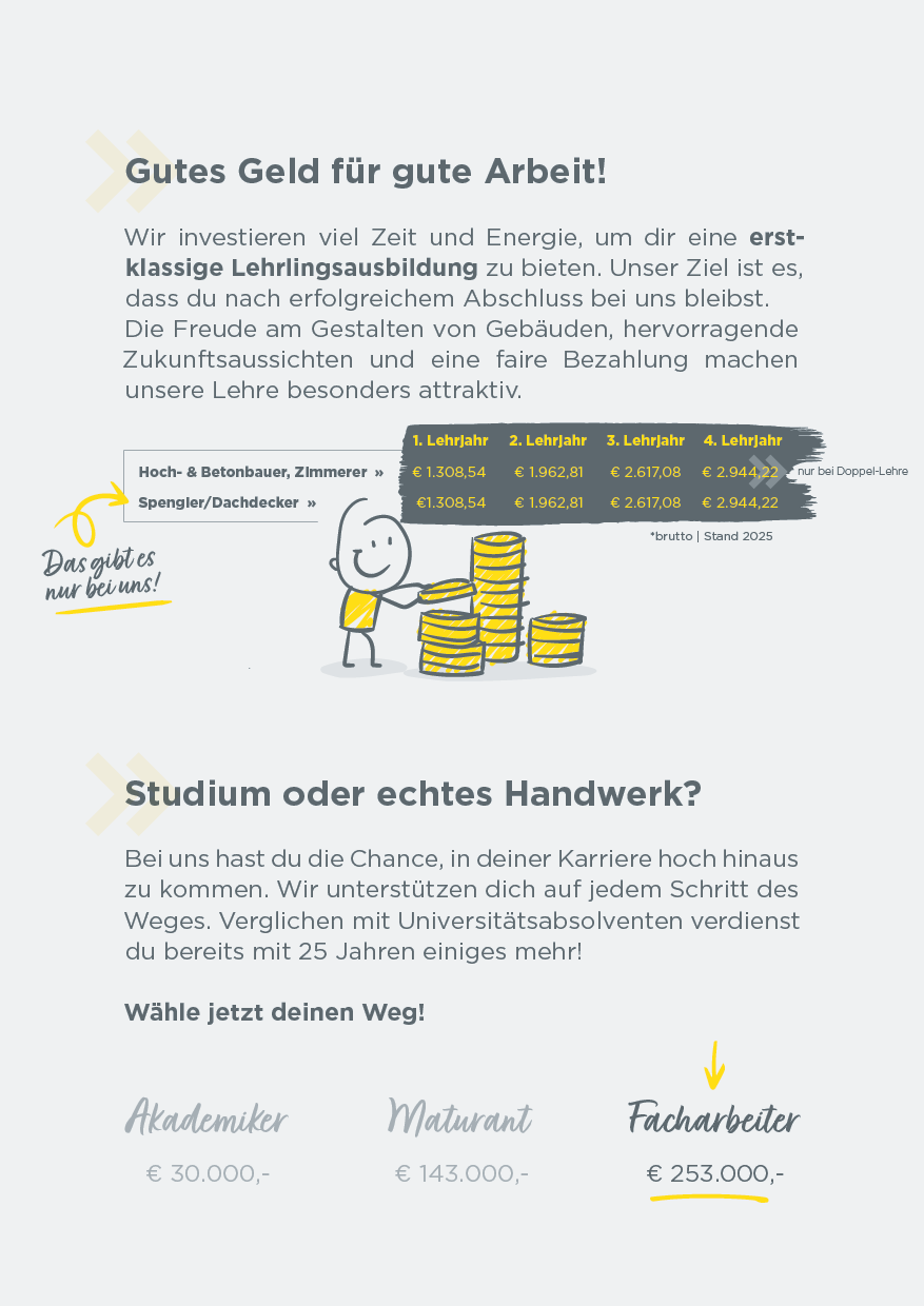 Nutze dein handwerkliches Talent und starte deine Karriere mit einer Ausbildung am Bau! Setze den ersten Grundstein für deinen beruflichen Erfolg. Wir sind stets auf der Suche nach engagierten, jungen Talenten, die sich für den Hochbau, Betonbau, Dachdecker-, Spengler– oder Zimmerer-Beruf begeistern.
